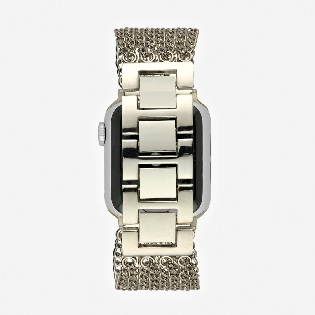 Crafted from premium stainless steel and twisted into elegant link chains, this band is definitely going to become a favourite on your Apple Watch. Need to resize your band to make it smaller? Simply flick open the clasp links with your nail – no tool required! Dimensions 38mm 40mm 41mm 42mm (S10 & S11): F