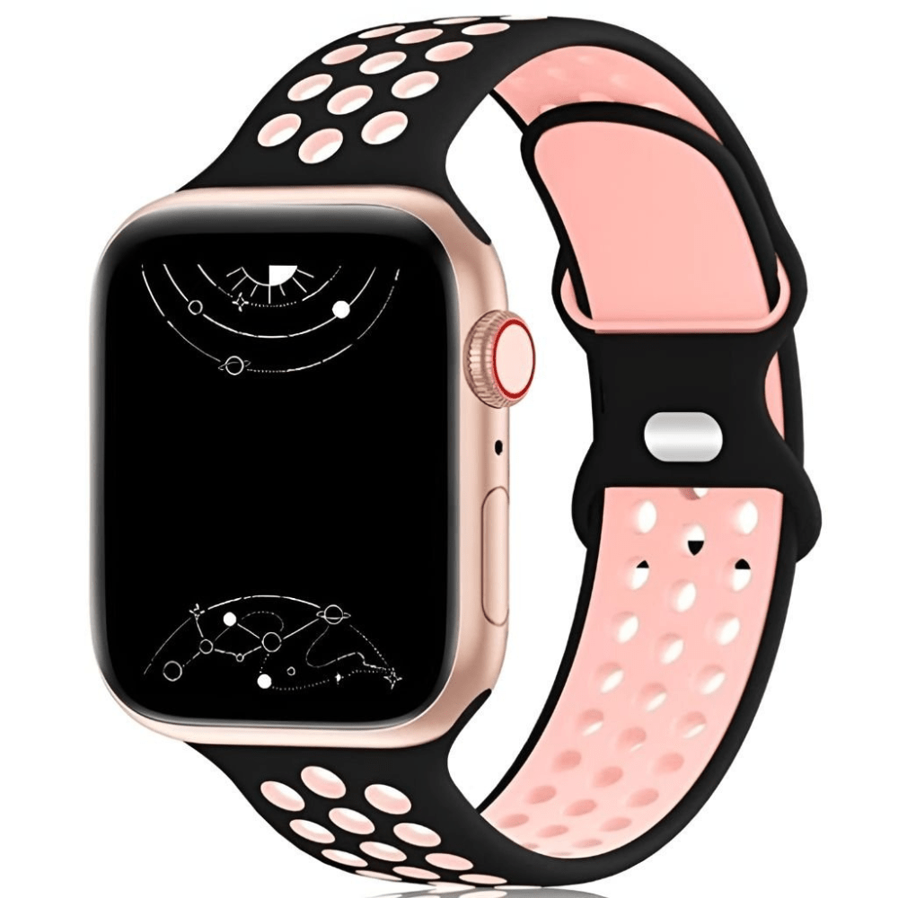 The Pax Silicone Sports Band is guaranteed to be able to keep up with your activities, from daily wear to extreme sports. Waterproof, durable, and stylish – what more can you ask for? The silicone material is lightweight and equipped with air holes for improved ventilation. The bottom line is: this comfortable watch band will make you feel unstoppable. Features: High-quality and durable silicone material Perfect for sports activities Comfortable for daily wear Waterproof and easy to clean Equipped with air holes for ventilation Stylish design that suits all outfits, from casual wear to formal wear Flexible watch band that feels great on the skin Secure buckle to keep your watch on at all times Available in different vibrant color combinations: black-blue, gray-white, white-black, red-black, blue-white, black-pink, teal-green, blue-black, black-gray, black-yellow, black-green, black-red, black-white, gray-black, and purple-brown Fits Wrist Size: Is adjustable to fit most wrist sizes. Compatible with Apple Watch Series 1, 2, 3, 4, 5, 6, 7, 8, 9, 10, 11, SE, SE 2, SE 3, Ultra, Ultra 2, and Ultra 3